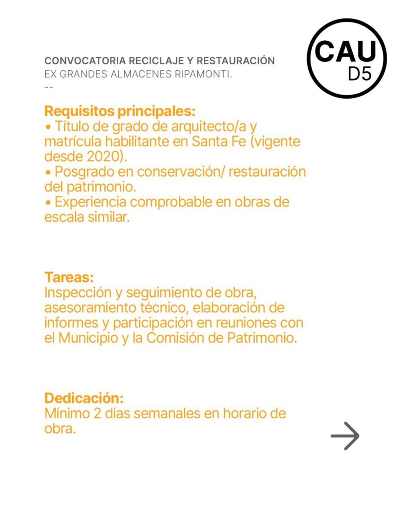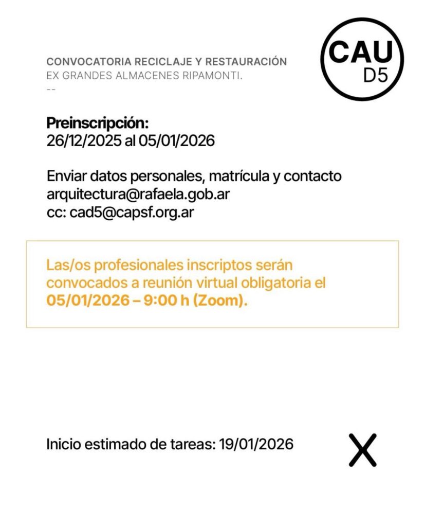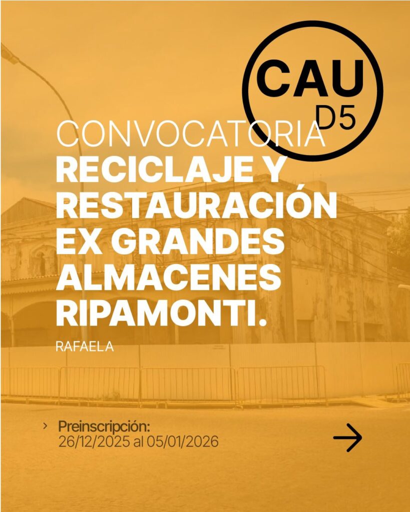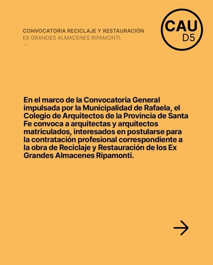 En el marco de la Convocatoria General impulsada por la Municipalidad de Rafaela, el Colegio de Arquitectos de la Provincia de Santa Fe convoca a arquitectas y arquitectos matriculados, interesados en postularse para la contratación profesional correspondiente a la obra de Reciclaje y Restauración de los Ex Grandes Almacenes Ripamonti.
